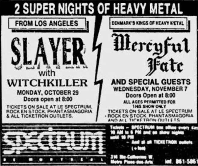- 29/10/1984; Concert at The Spectrum, Montreal, QC, Canada. with Witchkiller.