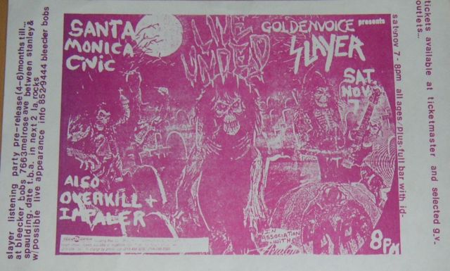 07/11/1984; Concert at Santa Monica Civic, Santa Monica, CA, USA. with Overkill & Impaler. (cancelled). (some flyers list wrong date).