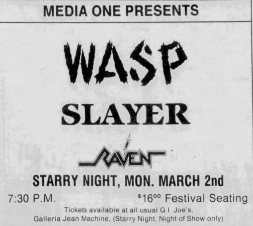 - 30/11/1984; Concert at Villa Fontana, San Antonio, TX, USA. with S.A. Slayer, Militia & Syrus.