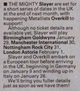 Listed Below is all of the known Tour Dates, Album, E.P. & Singles release dates that I have info on for this legendary thrash band. I know there is a hell of a lot more info out there so if you can help let me know. The tours I know of are marked in red. I'm after any Tickets scans, Tour Posters / Flyers, Tour Shirts, Magazine Adverts etc.; hector.kirkwood @ gmail.com