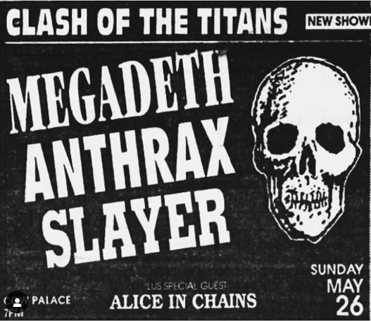 - 26/05/1991; Concert at Cow Palace, Daly City, CA, USA. opening for Megadeth with Anthrax & Alice In Chains.