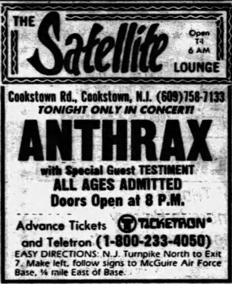 - 07/08/1987; Concert at The Satellite Lounge, Cookstown, NJ, USA. opening for Anthrax.