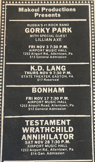 - 08/08/1987; Concert at Airport Music Hall, Allentown, PA, USA. opening for Anthrax.