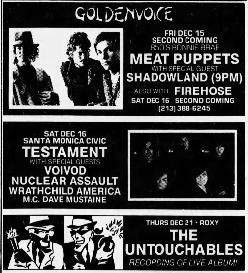 - 26/11/1986; Concert at The Scottish Rite Temple, Oakland, CA, USA. opening for Suicidal Tendencies, Laaz Rockit & Forbidden Evil.