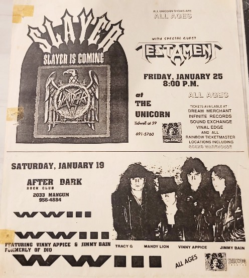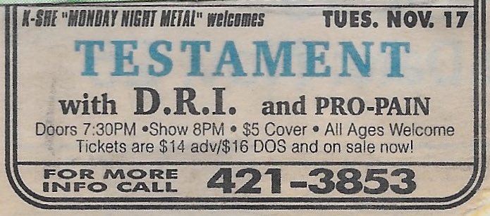 - 05/07/1987; Concert at The Old World Beer Gardens, Corona, CA, USA. opening for Anthrax & Metal Church.