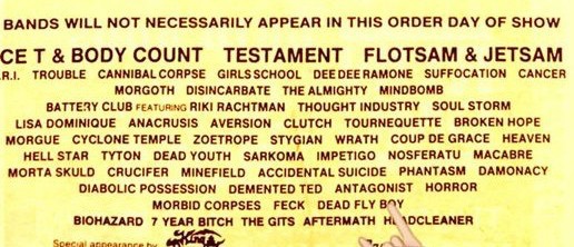 - 25/04/1986; Concert at Pomona Valley Auditorium, Pomona, CA, USA. opening for Anthrax, with Abattoir.
