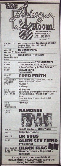 - 17/04/1986; Concert at The Living Room, Providence, RI, USA. with Painted Willie & Gone.
