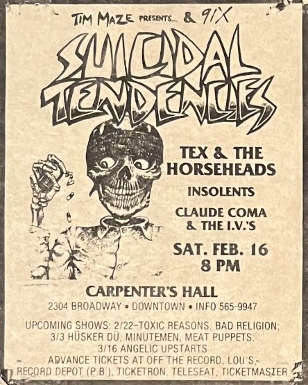 - 16/02/1985; Concert at Carpenter's Hall, San Diego, CA, USA. with Tex & The Horseheads & asst.