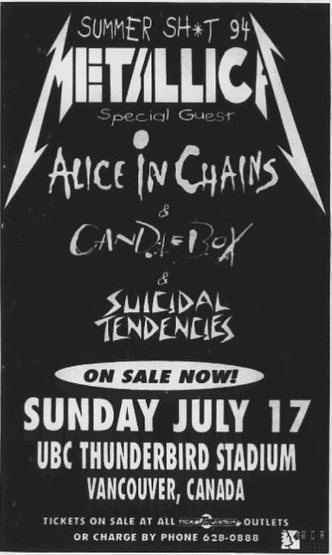 - 17/07/1994; Concert at UBC Thunderbird Stadium, Vancouver, BC, Canada. opening for Metallica, with Alice In Chains & Candlebox.