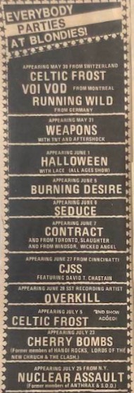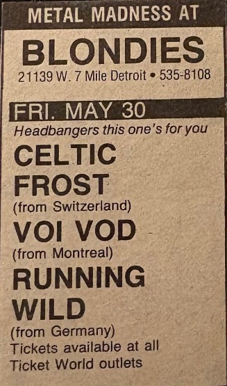 30/05/1986; Concert at Blondie's, Detroit, MI, USA. with Voivod & Running Wild. (postponed to 05 & 06/07).