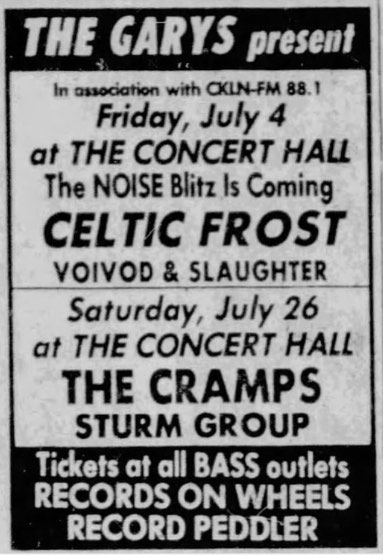 24/05/1986; Concert at The Concert Hall, Toronto, ON, Canada. with Voivod & Running Wild. (postponed to 04/07).