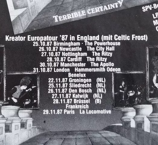 - 16/11/1986; Concert at The Volkshaus, Zurich, Switzerland. with Kreator & Coroner.