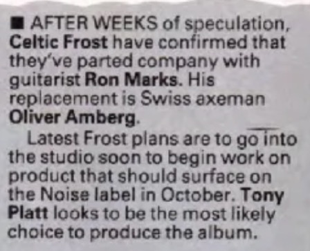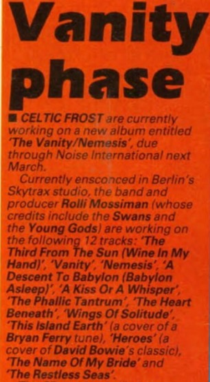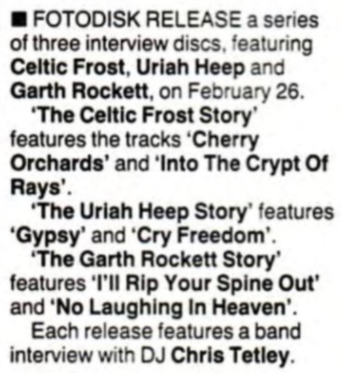 - 26/02/1990; 'The Celtic Frost Story, Chris Tetly Presents' interview/live ep released, live tracks from 03/03/89.