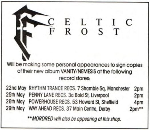 - 29/05/1990; Concert at The Assembly Rooms, Derby, England. with Mordred & Slammer. (Celtic Frost's final show until 2006).