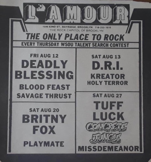 - 01/05/1987; Concert at L’Amours, Brooklyn, NY, USA. opening for Voivod.
