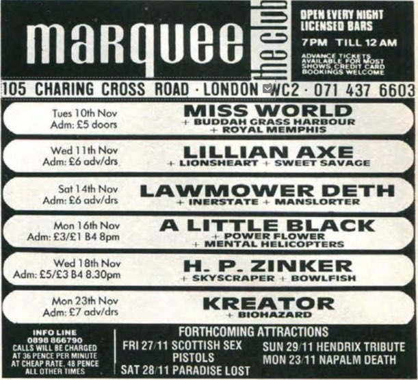 - 30/10/1987; Concert at The Hammersmith Apollo, London, England. opening for Celtic Frost, with Virus..