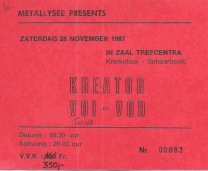 - 07/03/1987; Concert at Zaal Vooruit, Ninove, Belgium. opening for Onslaught, with Exhumer & asst. (possibly didn't play).