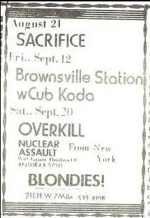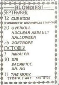 - 20/09/1986; Concert at Blondie's, Detroit, MI, USA. opening for Overkill, with Halloween.