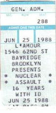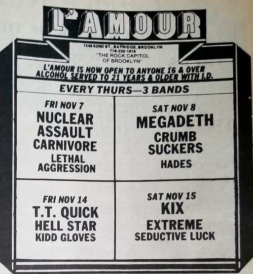 - 07/11/1986; Concert at L'Amour, Brooklyn, NY, USA. with Crumbsuckers/Carnivore & Lethal Aggression.