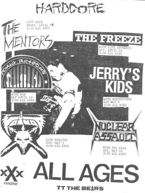 - 19/01/1986; Concert at Traxx, Detroit, MI, USA. with Heresy & N.Y.C. Mayhem.