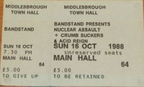 - 05/04/1985; Concert at The Showplace, Dover, NJ, USA. with Mayhem, Mental Abuse & Siezure.