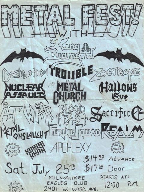 - 25/07/1987; Concert at Eagles Ballroom, Milwaukee, WI, USA. opening for King Diamond etc.. 'Milwaukee Metalfest'.
