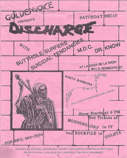 - 10/12/1983; Concert at Casa De, Santa Barbara, CA, USA. opening for Discharge, with Butthole Surfers, M.D.C. & Dr. Know.