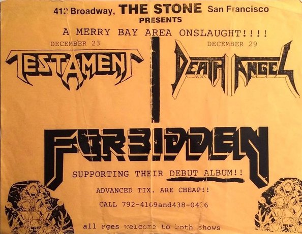 - 29/09/1987; Concert at The Stone, San Francisco, CA, USA. With Forbidden Evil, Blind Illusion, Bacchus & Sadus.
